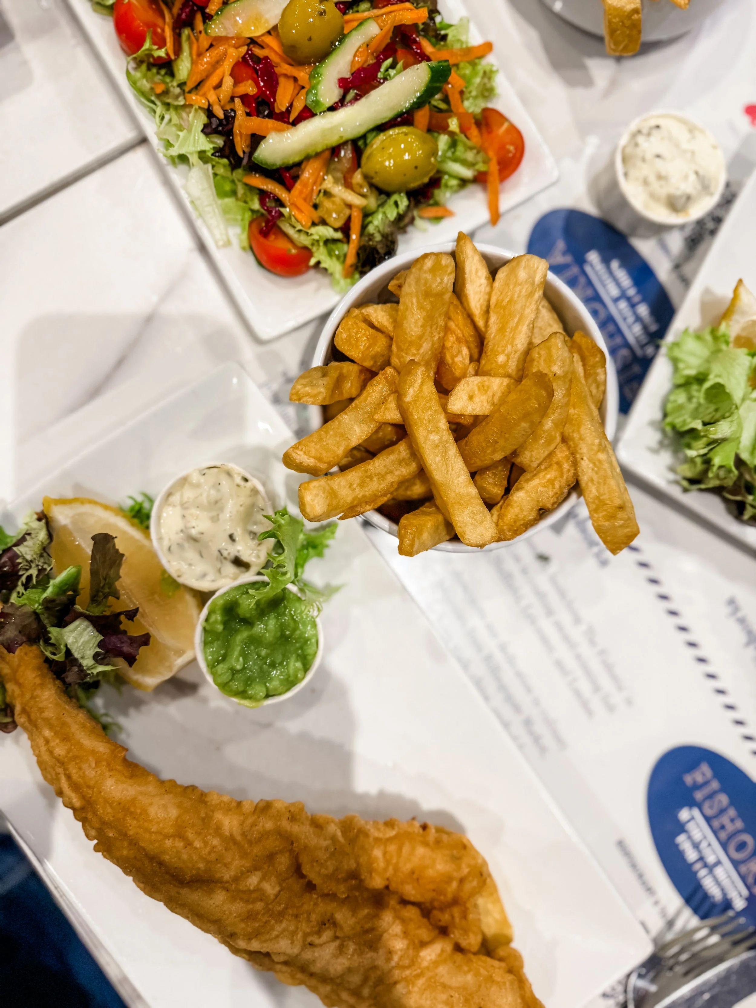 A trip to London isn’t complete without fish and chips! I found Fishoria and it was authentic, delicious and had a gluten free option which I loved! We started with a salad that had a nice briny dressing which was the perfect compliment to the salty entree.