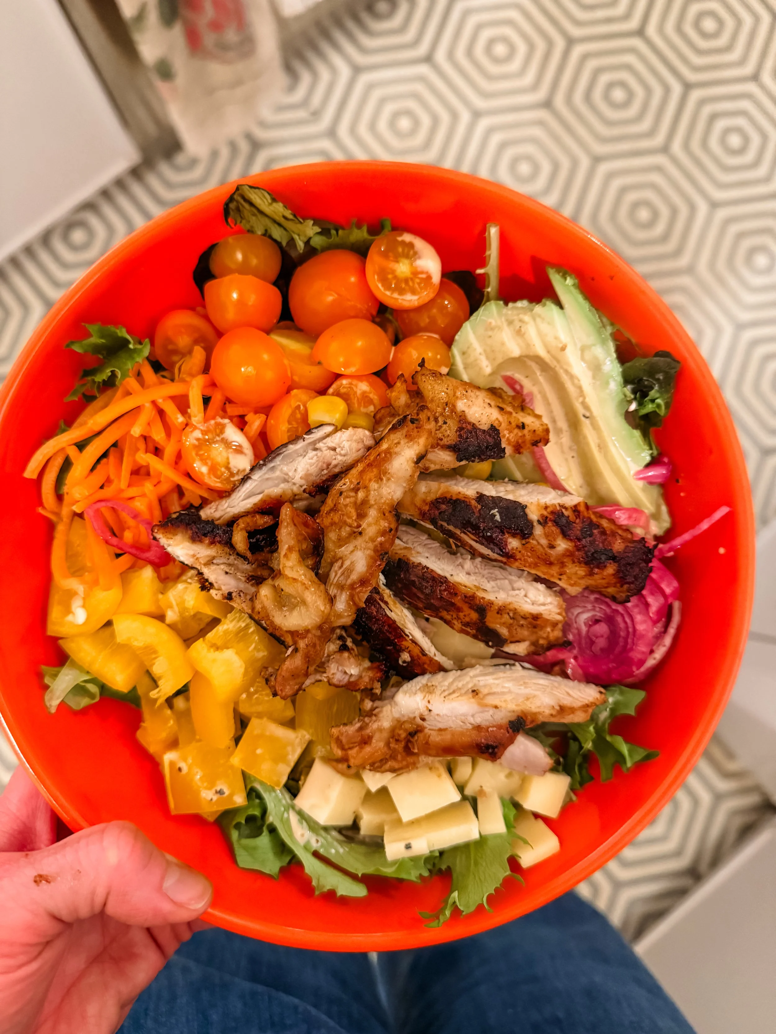 toss the salad with the dressing and once the chicken has cooled for a few minutes slice it up and top your salad with it